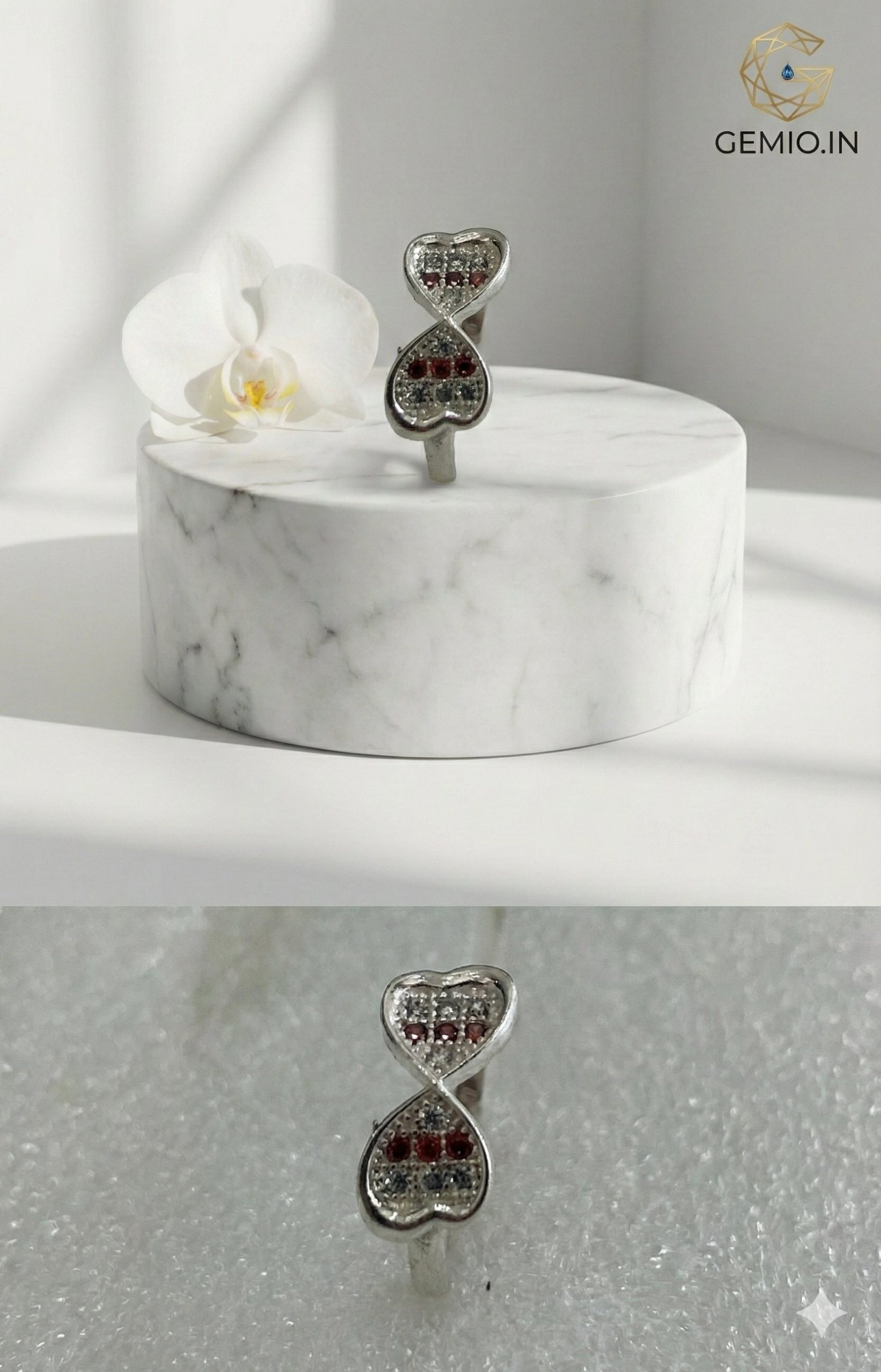 The ring is pavé-set with shimmering Cubic Zirconia (American Diamond) stones. The design alternates between sparkling clear crystals and deep ruby-red accents, creating a stunning contrast that catches the light from every angle. Whether it’s a promise ring, a Valentine’s surprise, or a treat for yourself, this ring adds a touch of romance and elegance to any outfit.