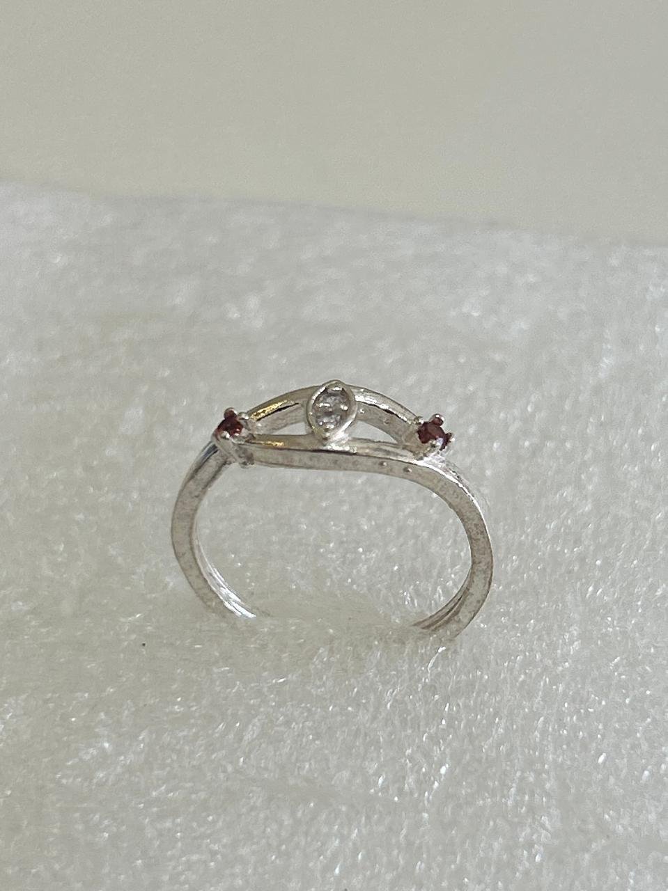 Flanking the center stone are two petite Red (Ruby-colored) accents, adding a subtle yet vibrant contrast. The slim band and low-profile setting make this ring incredibly comfortable, perfect for wearing alone for a simple look or stacking with other bands.